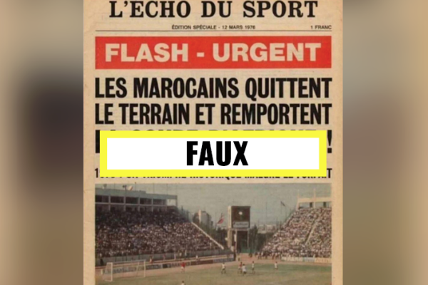 C’est une archive qui tombe à pic. Depuis plusieurs jours, la supposée couverture d’un journal, daté du 12 mars 1976, est abondamment partagée sur les réseaux sociaux. « Les Marocains quittent le terrain et remportent la Coupe d’Afrique ! », titre le prétendu journal. En dessous, une photographie d’un match de football est surmontée de la phrase : « 1976 : un triomphe historique malgré le forfait ». Ça ne vous rappelle rien ?