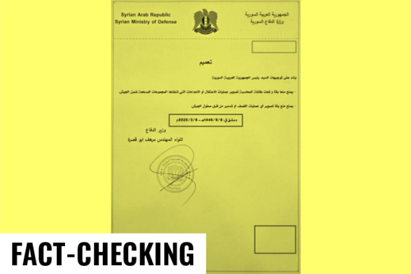 C’est dans ce climat de violences qu’un document troublant est apparu en ligne. Présenté comme un communiqué officiel du régime syrien, il ordonnerait aux forces de sécurité de ne plus filmer les bombardements et les destructions menées par l’armée. Un texte qui, s’il était authentique, ferait doublement scandale : il reconnaîtrait les exactions tout en révélant la volonté du pouvoir de les dissimuler. Or, après vérification, ce document est un faux.