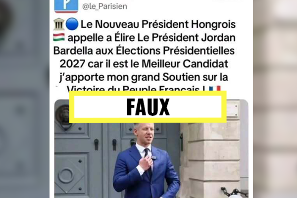 Sur le groupe Facebook « Union des droites d’abord », circule depuis le 18 avril 2026 une prétendue capture d’écran d’une publication du Parisien – Aujourd’hui en France sur le réseau social X qui affirme que le nouveau dirigeant hongrois appellerait à voter pour Jordan Bardella en 2027, « car il est le meilleur candidat ».