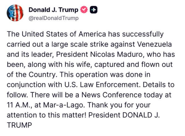 Message de Donald Trump. En Français : « Les États-Unis d’Amérique ont mené avec succès une frappe de grande ampleur contre le Venezuela et son dirigeant, le président Nicolás Maduro, qui a été, avec son épouse, capturé puis exfiltré hors du pays. Cette opération a été menée en coordination avec les forces de l’ordre américaines. Des détails suivront. Une conférence de presse aura lieu aujourd’hui à 11 heures, à Mar-a-Lago. Merci de votre attention à ce dossier ! Président DONALD J. TRUMP »
