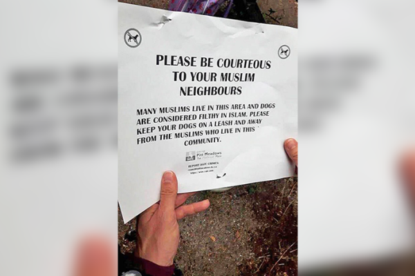 Les petits mots entre voisins sont communs, mais celui-ci a particulièrement attiré l’attention. « S’il vous plaît, soyez courtois avec vos voisins musulmans. De nombreux musulmans habitent dans cette zone et les chiens sont considérés comme sales dans l’islam. S’il vous plaît, gardez vos chiens en laisse et à l’écart des musulmans qui vivent dans cette communauté », est-il écrit en anglais sur une page imprimée dont la photo a été repartagée des milliers de fois.