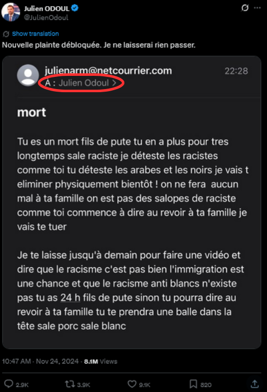 Le 18 novembre 2024, Julien Odoul porte plainte au commissariat de Sens (Yonne). L’élu aurait reçu une menace de mort sur sa boîte mail, dont il partage une capture d’écran sur les réseaux sociaux.