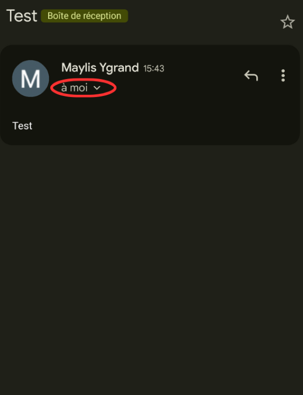 - Capture d’écran d’un test effectué par Les Surligneurs pour montrer que, sur la plupart des messageries, c’est “moi” qui apparaît lorsque c’est le destinataire qui consulte le message
