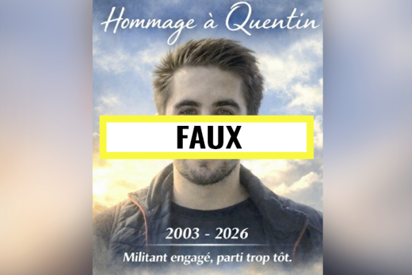 Sourire aux lèvres, regard droit, avec en toile de fond un ciel nuageux, une première image a particulièrement été partagée sur les réseaux sociaux. Sur le visuel en question, le supposé visage du militant d’extrême droite est surplombé des mots « Hommage à Quentin ». En dessous, il est possible de lire : « 2003-2026 » et « Militant engagé, parti trop tôt ». Cela ne fait aucun doute : la photographie en question est censée représenter Quentin Deranque.