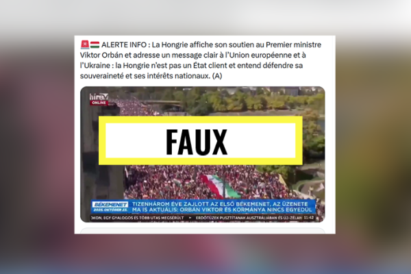 La vidéo est issue d’un reportage d’HirTV, une chaîne de télévision hongroise. La date du 23 octobre 2025 est indiquée sur le bandeau en bas à droite de l’écran. On peut également y lire différents titres : « La première marche pour la paix a eu lieu il y a treize ans, mais son message reste d’actualité : Viktor Orban et son gouvernement ne sont pas seuls », puis « Kinga Gál (le nom d’une députée européenne hongroise, ndlr) : L’Europe a besoin de paix ».