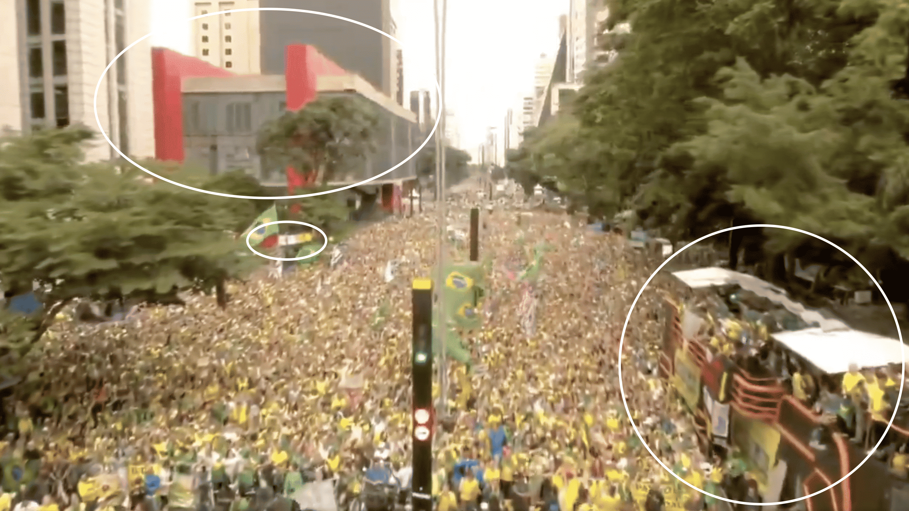 - Le premier cercle en haut à gauche attire l’attention sur le musée d’art de São Paulo, le deuxième juste en-dessous sur la banderole, et enfin le troisième cercle en bas à gauche entoure le camion avec des barrières oranges. (Capture d’écran X)