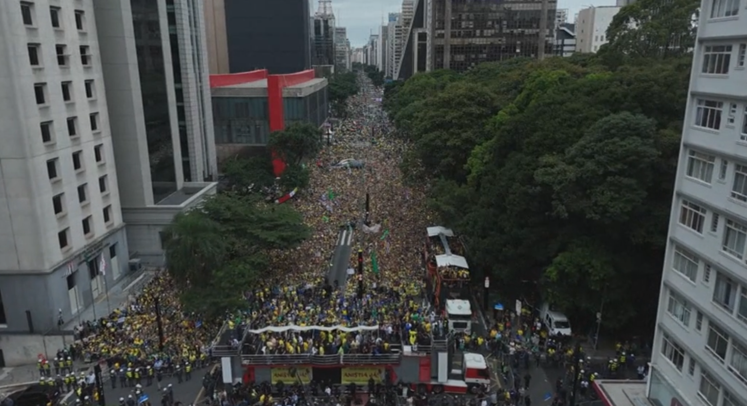 Depuis le 6 avril 2025, une vidéo circule largement sur les réseaux sociaux. On y voit une foule dense, vêtue de jaune et de vert, brandissant des drapeaux brésiliens, états-uniens et israéliens, et scandant « Anistia já ! » — « L’amnistie maintenant ».