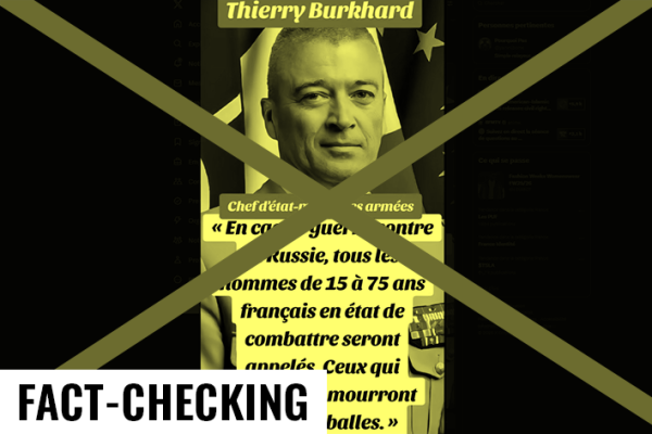 Depuis le 18 février 2025, des dizaines de publications rapportent, elles, des propos inquiétants de la part, disent-elles, du chef d’état-major des armées françaises. « Thierry Burkhard (chef d’état-major), un traître parmi les traîtres, menace les Français : ‘En cas de guerre contre la Russie, tous les hommes de 15 à 75 ans Français en état de combattre seront appelés. Ceux qui refuseront mourront sous nos balles' », décrit une publication, vue plus de 450 000 fois sur X.