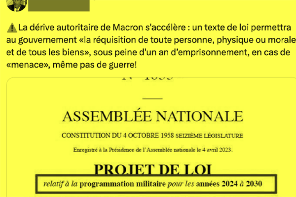 Établissant un lien aussi rapide que faux avec les réquisitions récentes de grévistes ordonnées sur la base du Code général des collectivités territoriales par les préfets, un commentateur non avisé (un économiste de formation avec 59 000 abonnés) ajoute sur Twitter : “La dérive autoritaire de Macron s’accélère : un texte de loi permettra au gouvernement «la réquisition de toute personne, physique ou morale, et de tous les biens», sous peine d’un an d’emprisonnement, en cas de «menace», même pas de guerre!”.