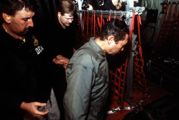 Le général Manuel Noriega est conduit à un siège à bord d’un avion de l’US Air Force par des agents de l’Agence américaine de lutte contre la drogue (DEA), en 1989. Domaine public.